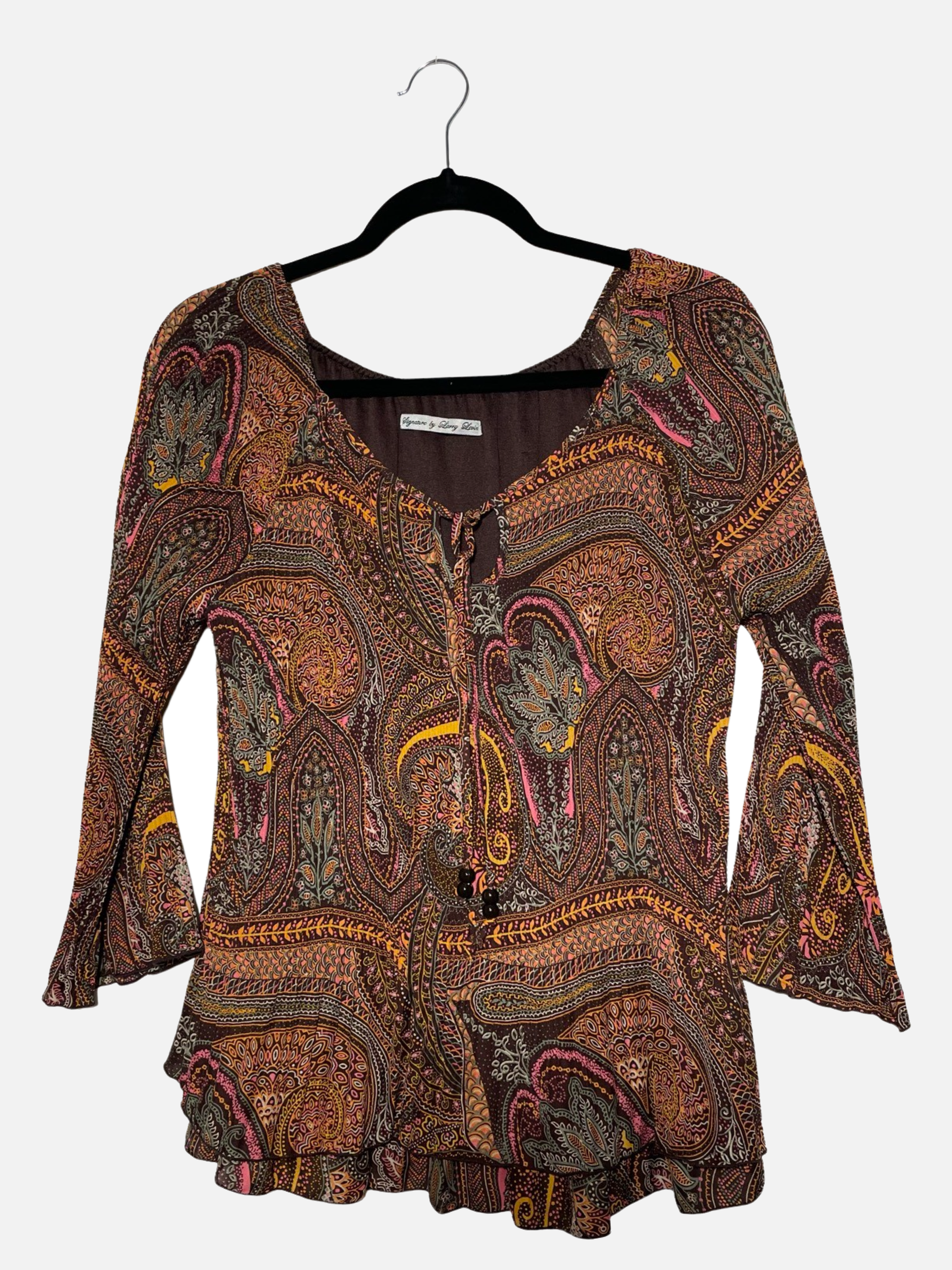 Paisley printed crinkle top. Long Sleeve. Lined. Tie neck.