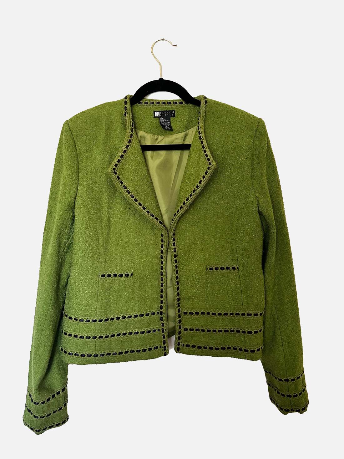 Boucle green Jacket. Open collar with black top stitching detail, long sleeve.