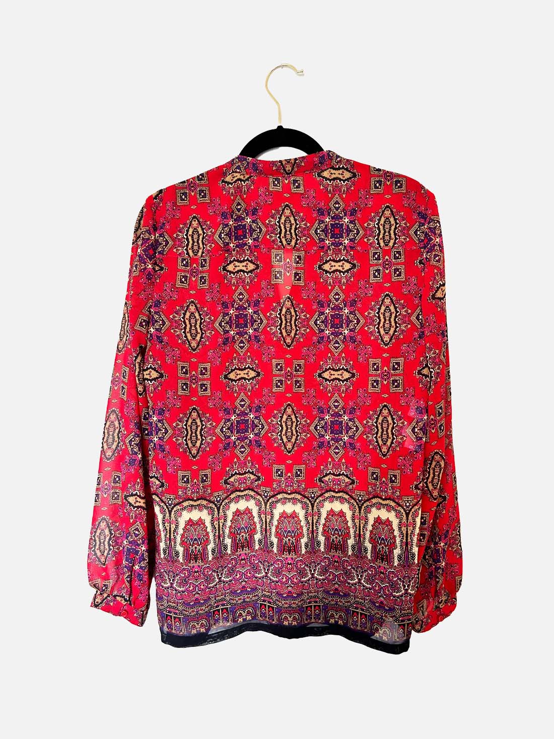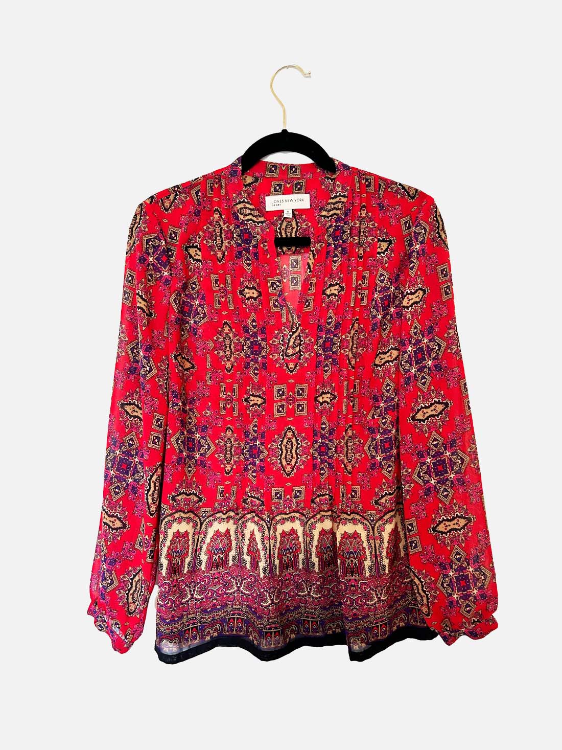 Woven, pleated, V-neck woven pull-over tunic top. Engineered medallion/ paisley print. Long sleeve. Slightly loose fit.